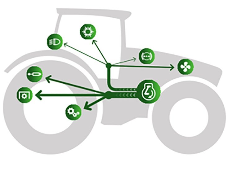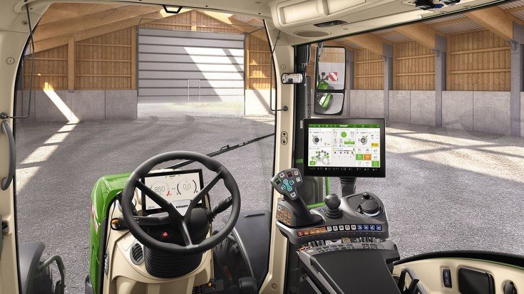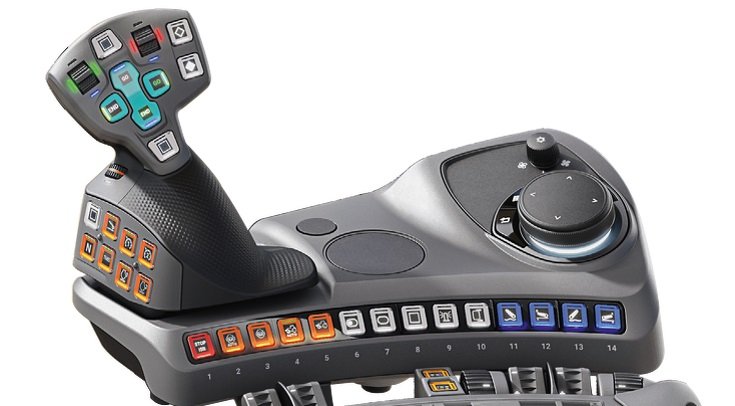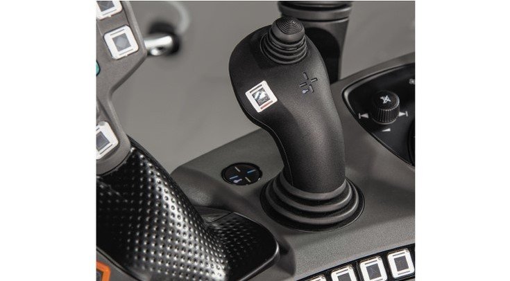 You can easily configure the main function groups in the main digital cockpit. To the left and right are the road travel information, on permanent display, and in the middle are four sections for different settings. In the non-display variant, you can easily control the main groups with the new pushdial on the right armrest: power lifts, hydraulics, engine and transmission, on-board computer with consumption readings, ventilation, lighting, front axle suspension, and valve assignment as well as service and diagnostics. As well as the familiar clover leaf operation, the new multifunction joystick includes two controls for proportional valve control as well as four freely assignable white keypads. This is where you can easily manage the usual transmission and driving functions with pushbuttons: including two engine speed programs, two cruise control settings and a new dial-controlled active cruise control setting. The lower control level includes the colored LED display for each setting. The driver immediately sees whether buttons have been re-allocated by the color concept. By default, these are the hydraulic valves. |